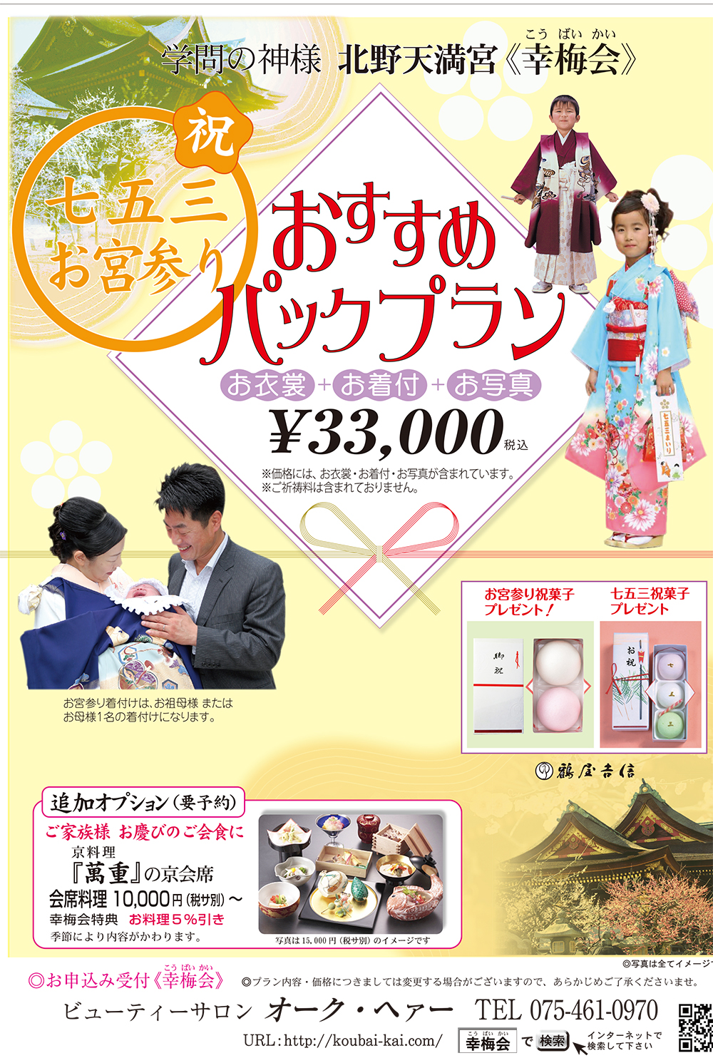 | 記念撮影 | 1ポーズ六ツ切台紙付1枚 ※追加撮影希望は当日お申し出ください。 六ツ切台紙付1枚 \9,900 (税込) ※11月の土日祝日は北野天満宮境内にて撮影致します。 ※月~金は当館 スタジオにて撮影をお願いする事があります。 |